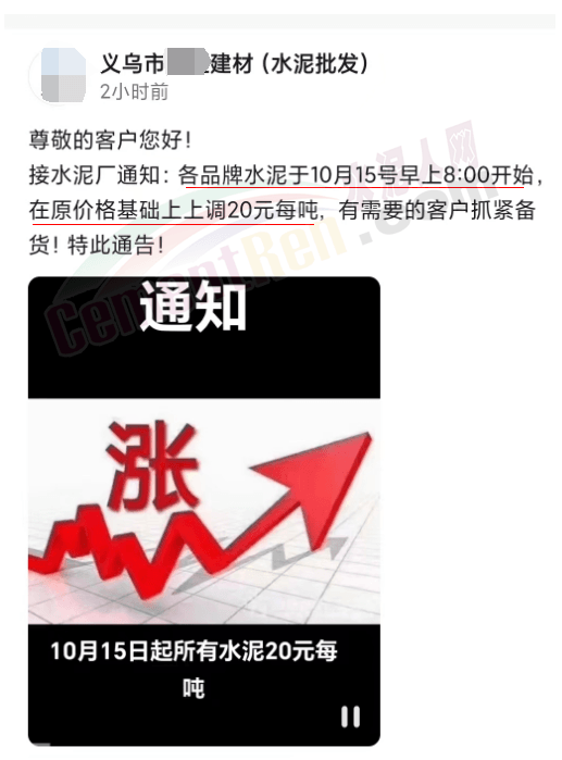 日前,浙江义乌市一水泥批发商发通知给客户称:接水泥厂通知,各品牌水泥于10月15日早上8时上调20元/吨,有需要的客户抓紧备货。