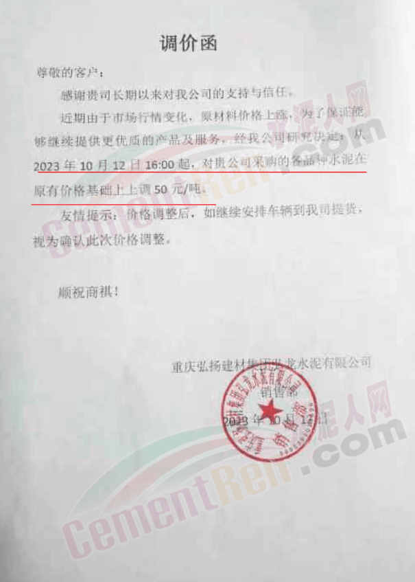 重庆弘扬建材集团卫龙水泥有限公司通知称,近期由于市场行情变化,原材料价格上涨,为了保证能够继续提供优质的产品及服务,经公司研究决定,从10月12日16时起,对公司采购的各品种水泥在原有价格基础上上调50元/吨。