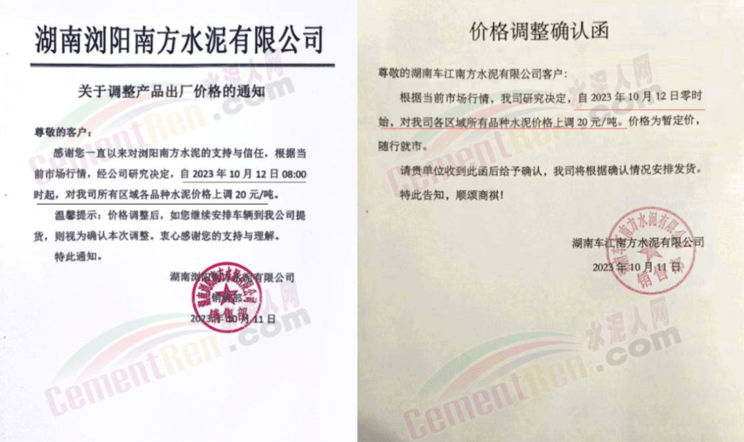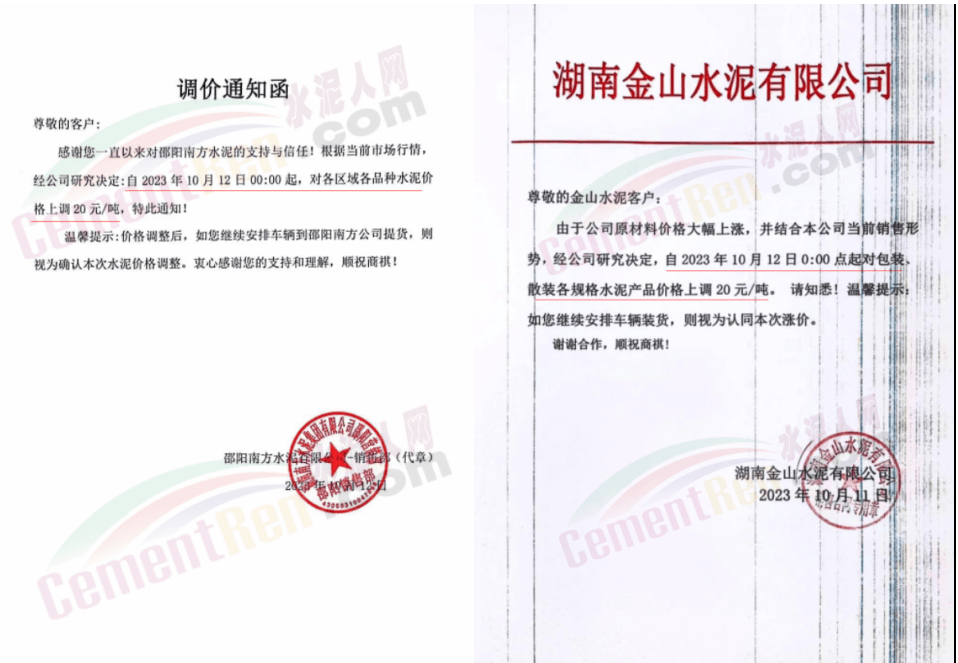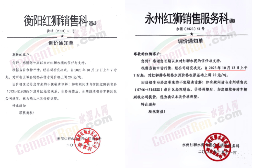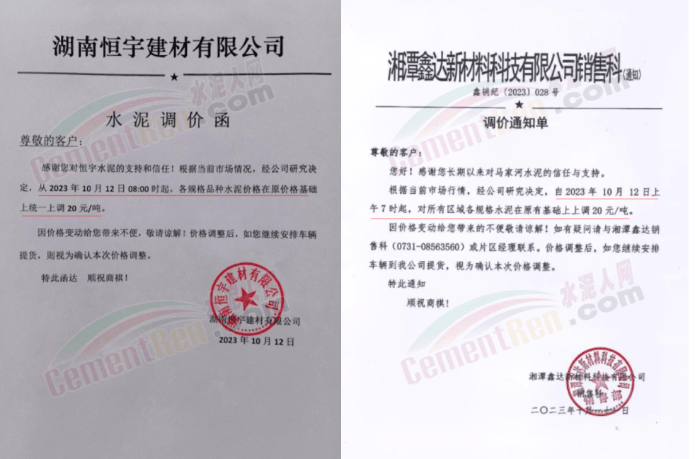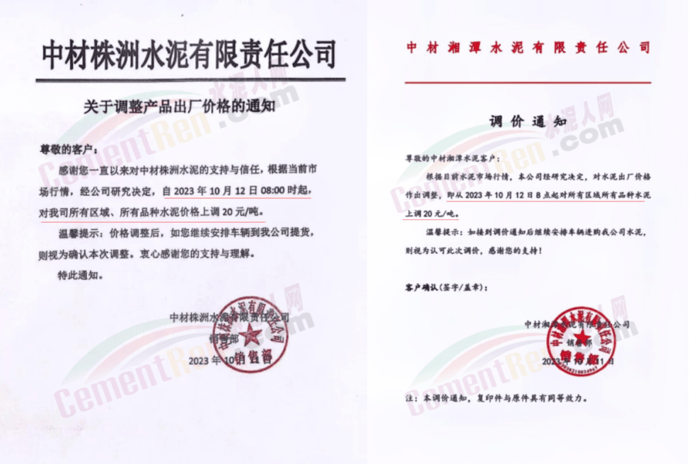 湖南区域中材株洲、中材湘潭、浏阳南方、车江南方、邵阳南方、华新水泥株洲公司、华新水泥冷水江公司、衡阳红狮、永州红狮、金山水泥、恒宇建材、湘潭鑫达新材料等企业通知,所有区域、所有品种水泥价格12日起上调20元/吨。