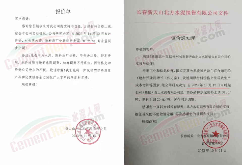 吉林区域,亚泰、北方、金隅冀东、山水水泥等企业通知上调水泥、熟料价格50-70元/吨。