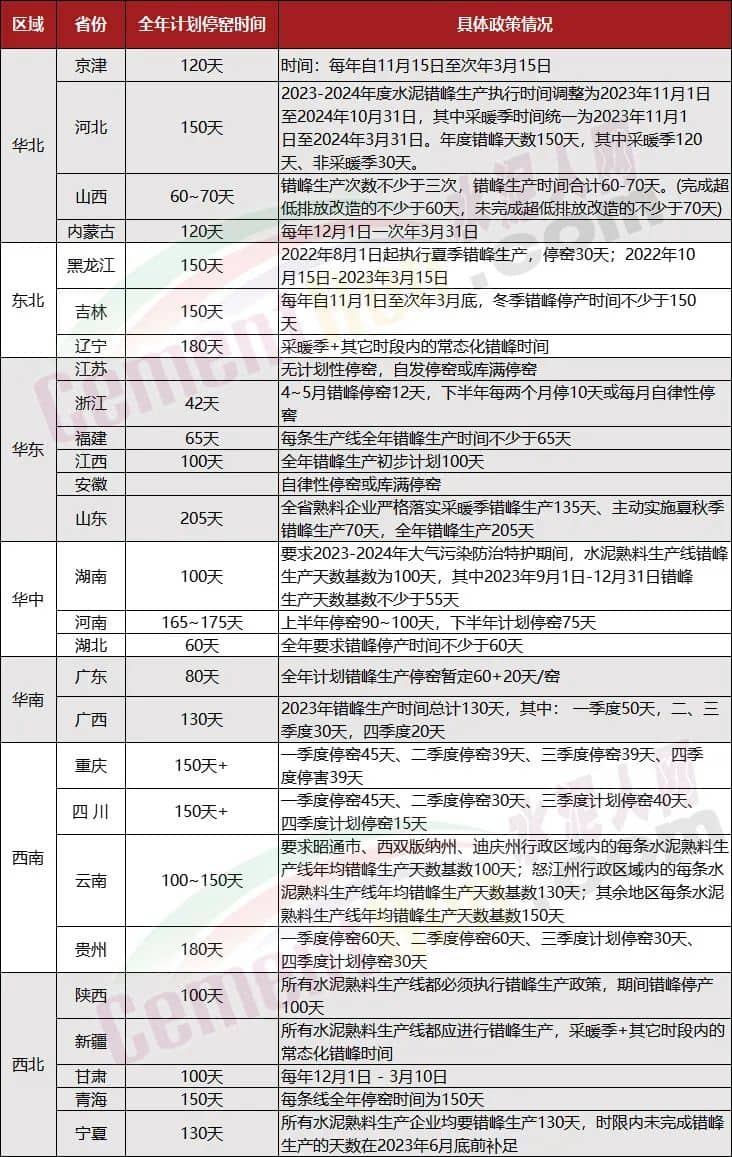 山西省,要求水泥行业2023年11月15日至2024年3月15日,全年合计错峰停窑180~190天。