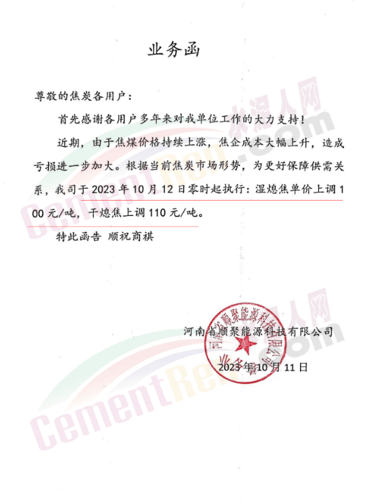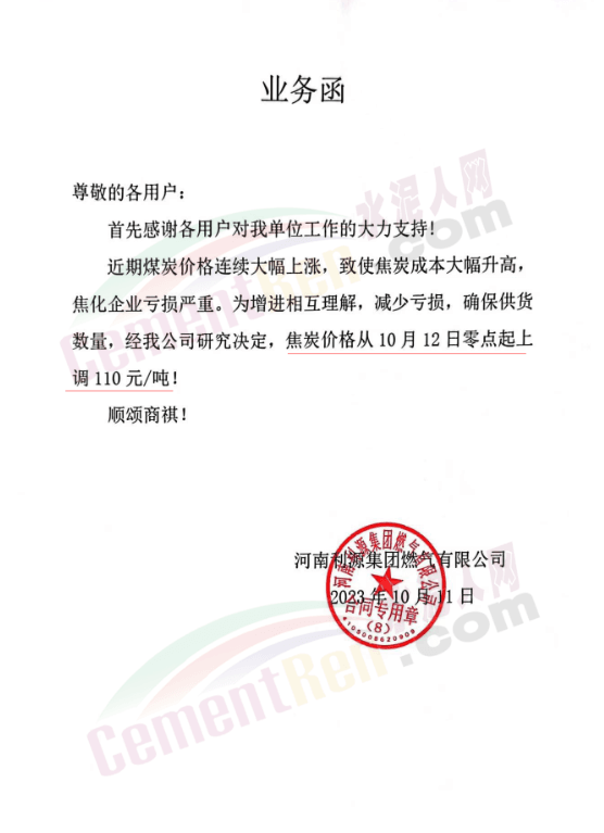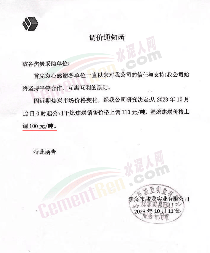 辽宁某混凝土企业通知,因水泥涨价,混凝土报价上调10元/吨。