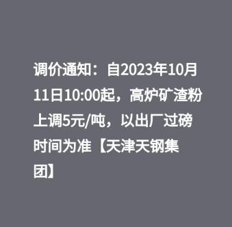 天钢集团通知:自10月11日10时起,高炉矿渣粉上调5元/吨。