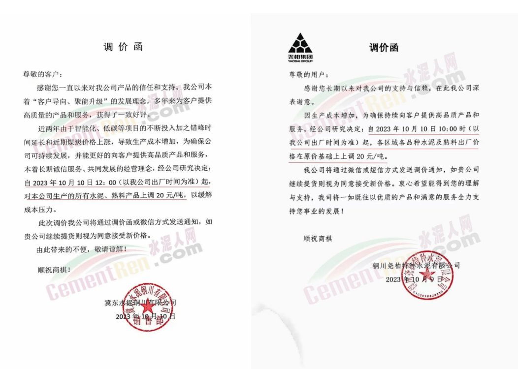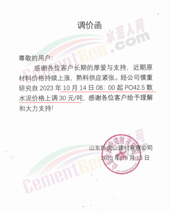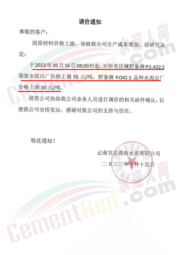 云南宜良西南水泥有限公司通知,因原材料价格上涨,导致公司生产成本增加,经研究决定于2023年10月16日8时起对所有区域野象牌P.S.A32.5袋装水泥出厂价格上调55元/吨,野象牌P.O42.5品种水泥出厂价格上调30元/吨。
