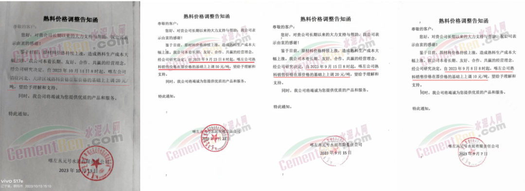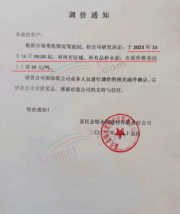 富民金锐水泥建材有限责任公司通知,根据市场变化情况等原因,经公司研究决定,于2023年10月16日8时起,对所有区域,所有品种水泥,在原价格基础上上调30元/吨。