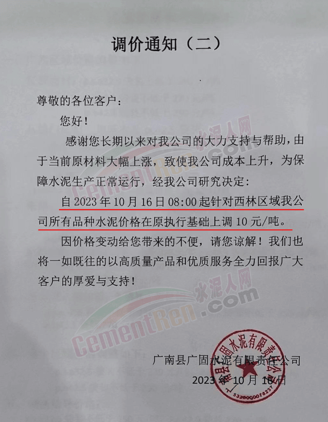 云南文山州广南县广固水泥有限公司通知,由于当前原材料大幅上涨,致使公司成本上升,为保障水泥生产正常运行,经公司研究决定,自2023年10月16日8时起,对西林区域我公司所有品种水泥价格在原执行基础上调10元/吨。