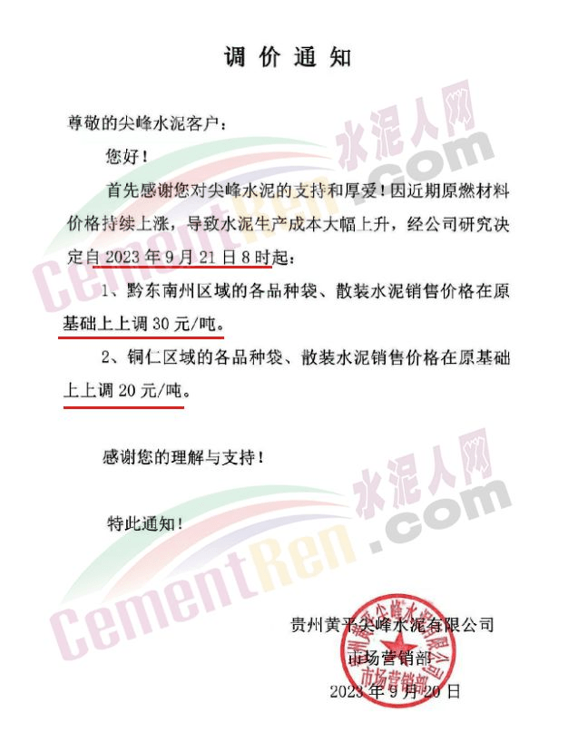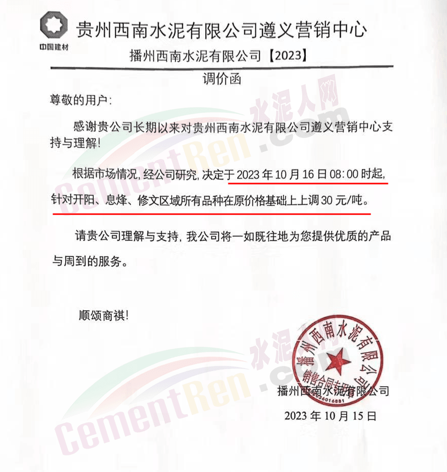 贵州播州西南水泥有限公司通知,根据市场情况,经公司研究,决定于2023年10月16日0800时起针对开阳、息烽、修文区域所有品种在原价格基础上上调30元/吨