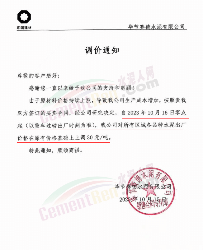 毕节赛德水泥有限公司通知,由于原材料价格持续上涨,导致公司生产成本增加,经公司研究决定,自2023年10月16日零点起,对所有区域各品种水泥出厂价格在原有价格基础上上调30元/吨。