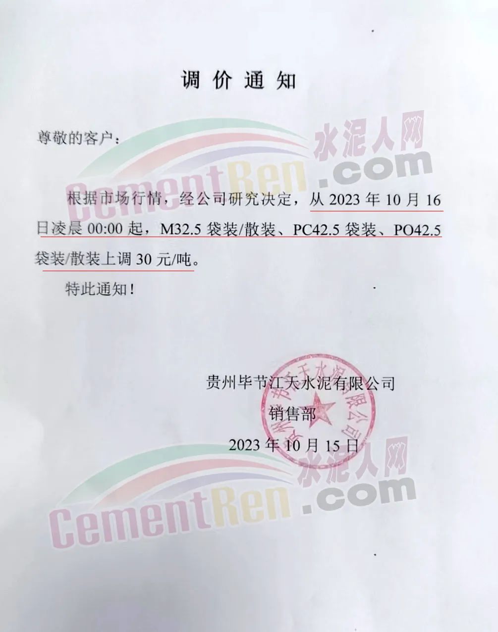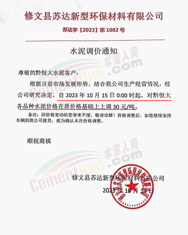 广西桂林修文县苏达新型环保材料有限公司通知,根据目前市场发展形势,结合公司生产经营情况,经公司研究决定,自2023年10月15日0时起,对黔恒大各品种水泥价格在原价格基础上上调30元/吨。