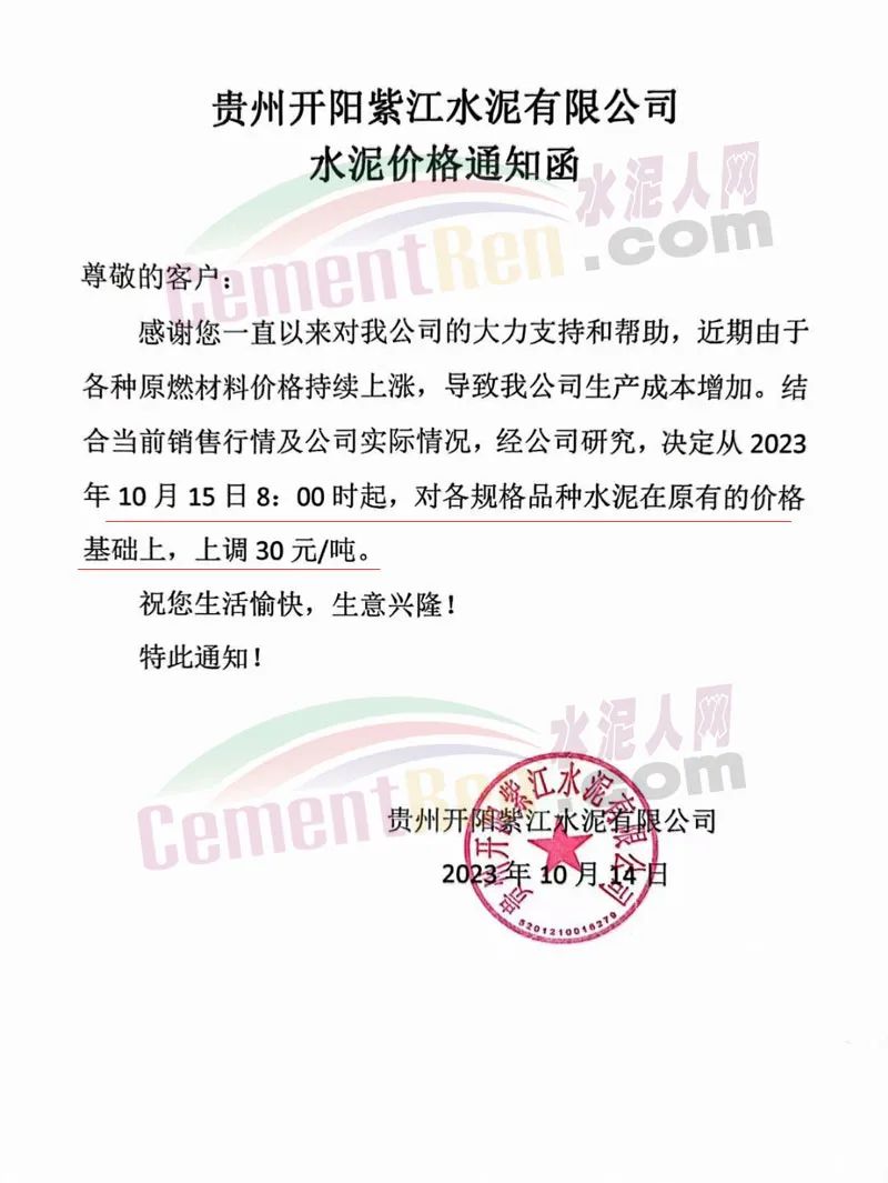 贵州开阳紫江水泥通知,近期由于各种原燃材料价格持续上涨,导致公司生产成本增加。结合当前销售行情及公司实际情况,经公司研究,决定从2023年10月15日8时起,对各规格品种水泥在原有价格基础上,上调30元/吨。