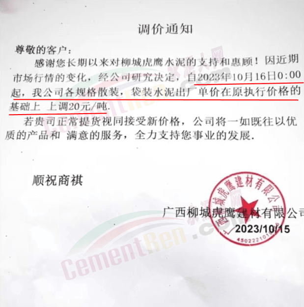 广西柳城虎鹰建材有限公司通知,因近期市场行情的变化,经公司研究决定,自2023年10月16日0时起,公司各规格散装,袋装水泥出厂单价在原执行价格基础上上调20元/吨。