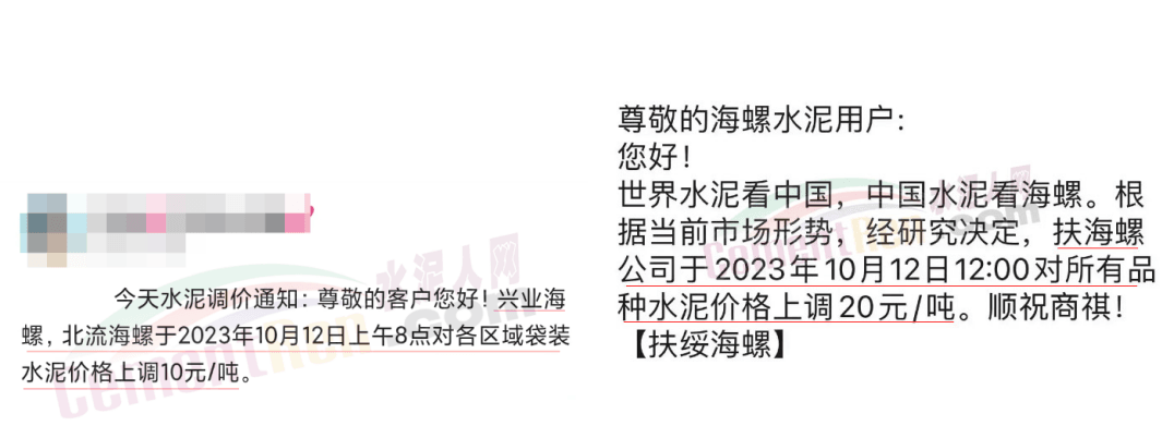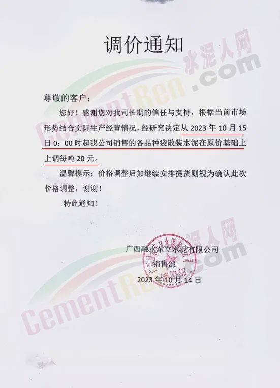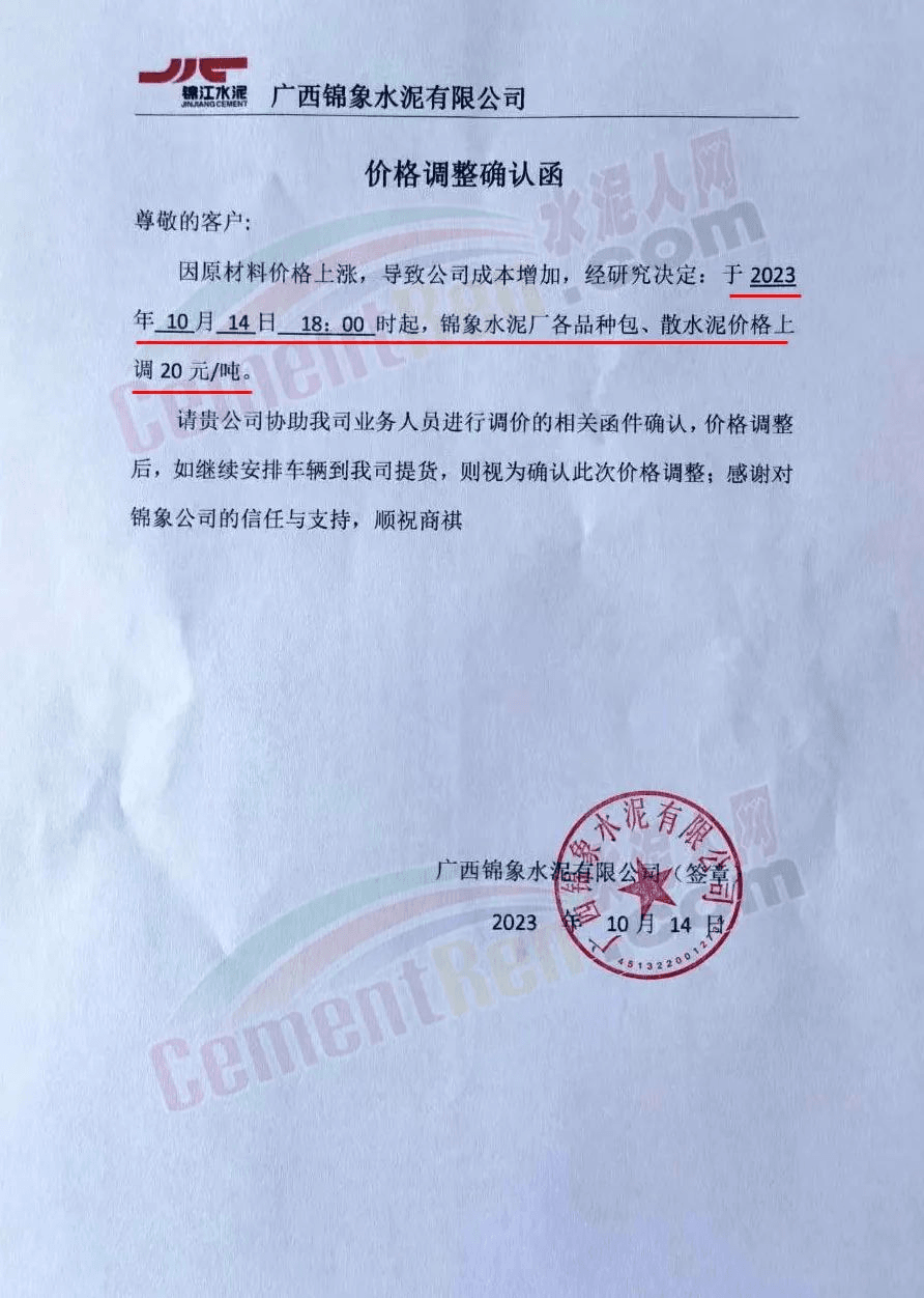 广西新建线企业锦象水泥通知,因原材料价格上涨,导致公司成本增加,经研究决定,于2023年10月14日起,各品种包、散水泥价格上调20元/吨。