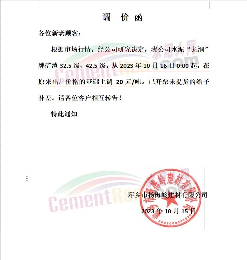 江西萍乡梅岭建材有限公司通知,10月16日0时起,“龙洞”牌水泥在原基础上上调20元/吨。