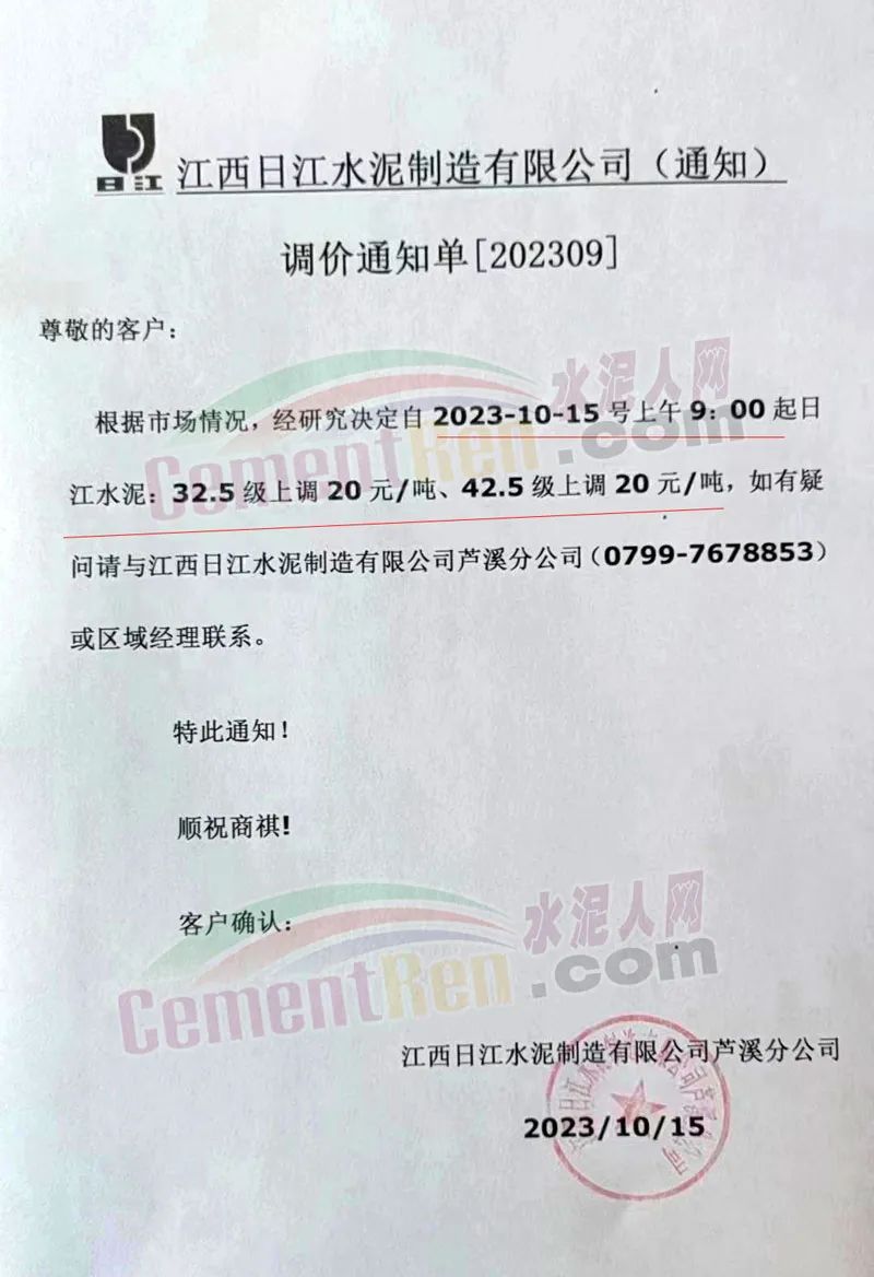 江西日江水泥制造有限公司通知,根据市场情况,经研究决定自2023年10月15日上午9时起各标号水泥价格上调20元/吨。