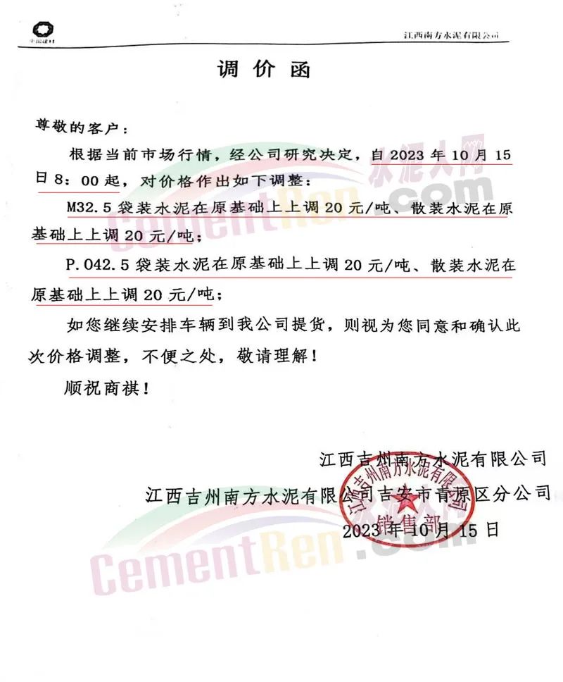 江西吉州南方水泥吉安青原区分公司通知,根据当前市场行情,经公司研究决定,自2023年10月15日8时起,各标号水泥上调20元/吨。