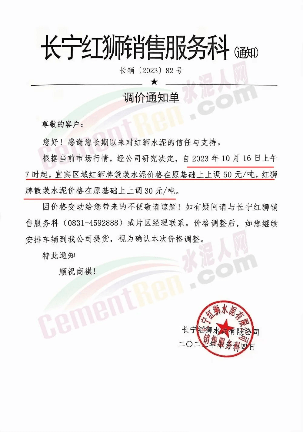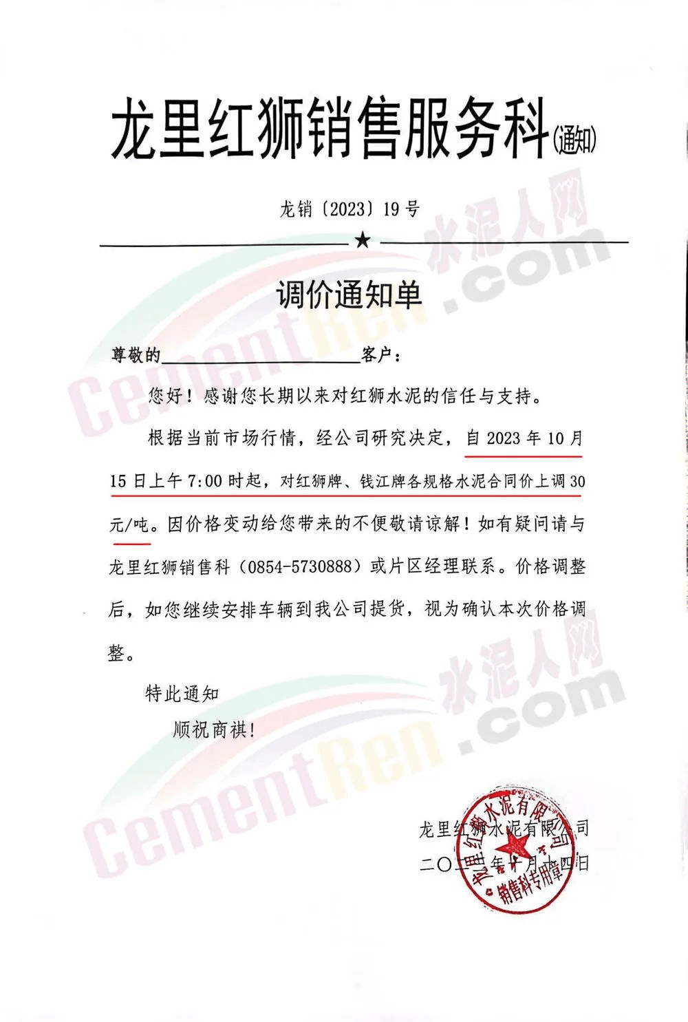 红狮水泥旗下祥云建云水泥有限公司销售科通知,根据当前市场行情,经公司研究决定,自2023年10月16日上午7时起,楚雄片区(含搅拌站)钱江牌、红狮牌各规格水泥价格上调30元/吨。
