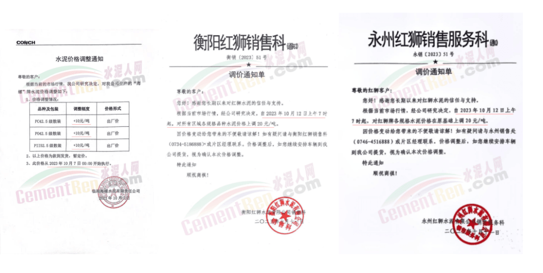 15日前后,贵州红狮、西南、尧柏水泥等主要品牌企业通知上调水泥报价30元/吨。龙里红狮销售服务科通知,自2023年10月15日上午7时起,对红狮牌、钱江牌各规格水泥合同价上调30元/吨。