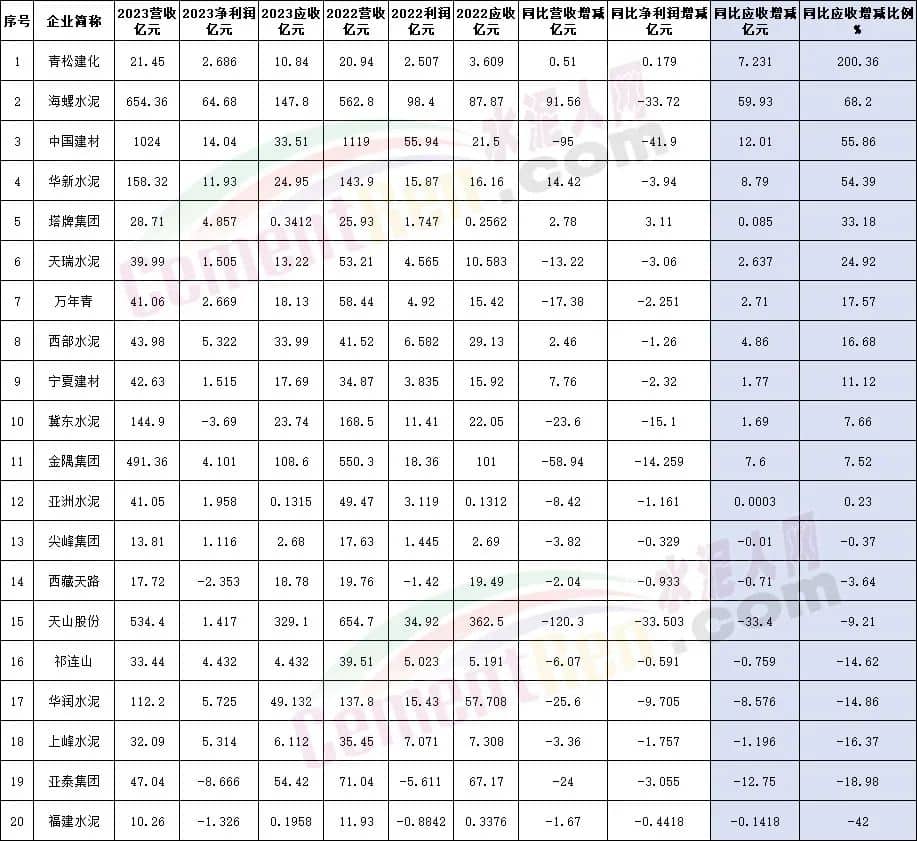 从应收款规模来看,20家上市企业中12家应收账款增加,占比达60%。其中海螺水泥2023年上半年同比2022年同期应收账款及票据增加59.93亿元,增幅达68.2%。同期营业收入增加91.56亿元,净利润减少33.72亿元,增收不增利的情况明显。