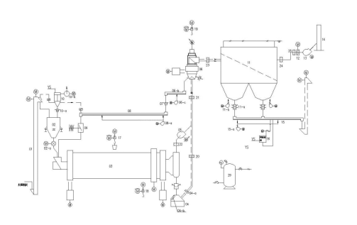 该系统采用管磨机+选粉机的闭路粉磨系统。磨机为浙江同力公司产品,规格为φ3.2x14m;选粉机选用江苏吉能达公司产品,规格为JND-GB-C4。由超细复合矿物掺合料球磨机、提升机、选粉机、高效袋收尘器、排风机等组成的超细复合矿物掺合料闭路粉磨系统。为了保证系统正常工作,在进入球磨机前设有称重稳流仓,球磨机后设有料气混合装置。