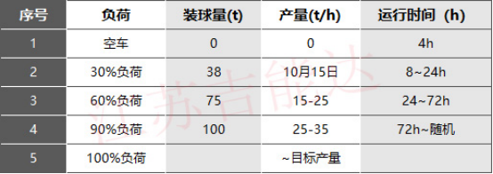 试车阶段时间(h)装球量(t)产量(t/h)(由吉能达公司现场人员调配)