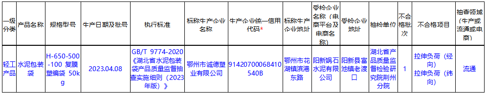 10月13日,湖北省市场监督管理局通报标称生产企业名称为鄂州市诚德塑业有限公司的一个批次水泥包装袋产品不合格,不合格项目为拉伸负荷,不合格品受检企业为阳新娲石水泥有限公司。