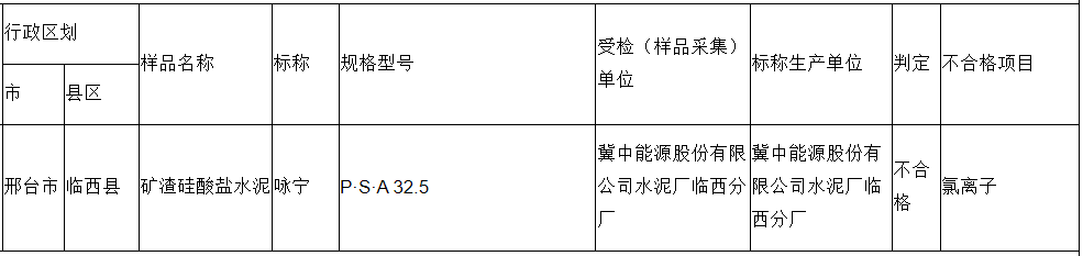9月4日,河北省市场监督管理局通报标称生产单位为冀中能源股份有限公司水泥厂临西分厂的1批次“咏宁”牌矿渣硅酸盐水泥(PSA.32.5)氯离子项目不合格。