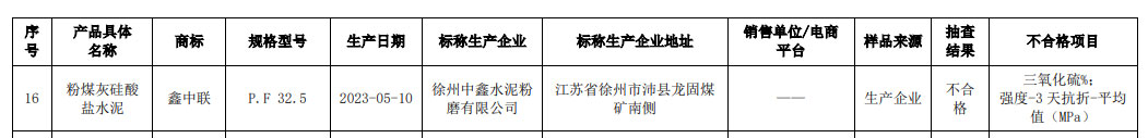 8月21日,江苏省徐州市市场监管局通报标称徐州中鑫水泥粉磨有限公司生产的1个批次粉煤灰硅酸盐水泥质量不合格,不合格项目为三氧化硫%、强度-3天抗折-平均值(MPa)。