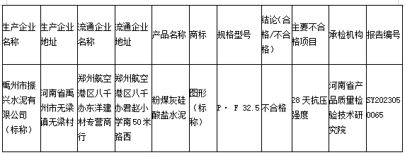 8月25日,河南郑州市场监管局通报,标称为禹州市振兴水泥有限公司1批次水泥抗压强度不合格。
