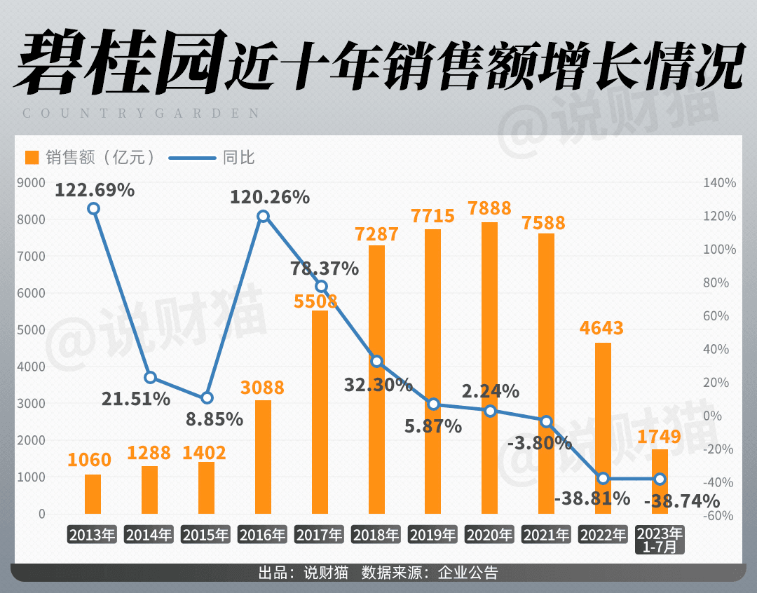 碧桂园近几年房产售价持续下滑,仅2020到2022年,碧桂园全国折合均价持续下降,分别为8402元/平方米、8033元/平方米、7886元/平方米,但2022年,碧桂园销售额仍然大跌38.81%,减少了近3000亿,交出了并不完美的答卷。2023年上半年更是巨亏514.61亿,可谓是生存艰难。