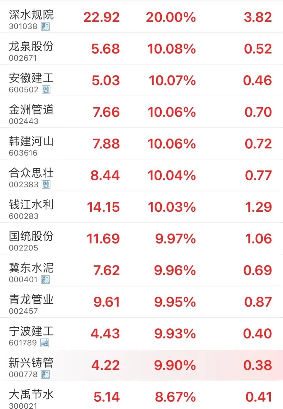 受增发1万亿元国债利好提振,A股闻“基”起舞,水利、水泥制造、基建、工程器械、钢铁、建筑等大基建产业链全线暴涨。 水利板块中,深水规院以20%幅度涨停,龙泉股份、安徽建工、金洲管道、韩建河山、合众思壮、钱江水利、国统股份、冀东水泥、青龙管业等10余只个股涨停。