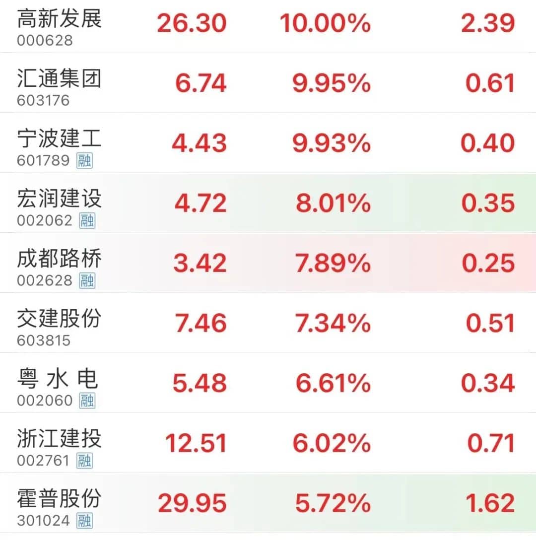 工程建设板块中,高新发展、安徽建工、汇通集团、宁波建工等涨停,宏润建设、成都路桥、交建股份等涨幅靠前。
