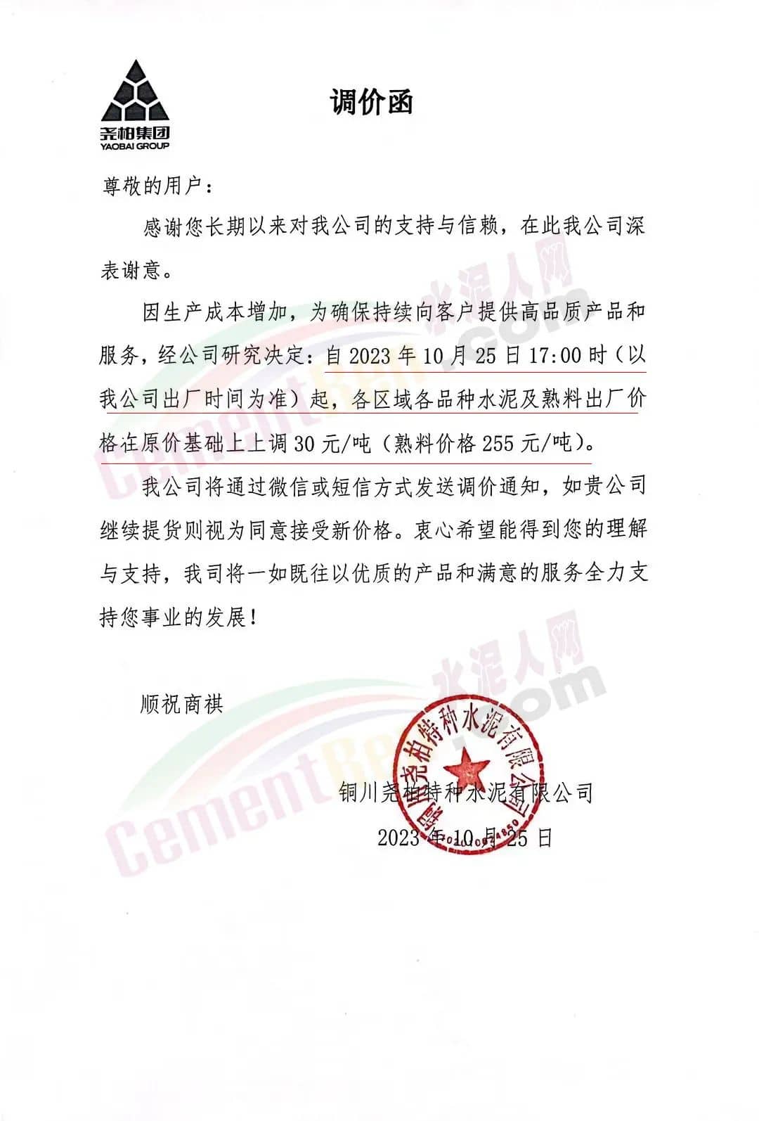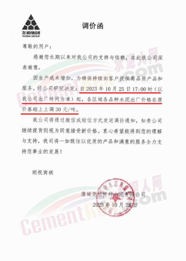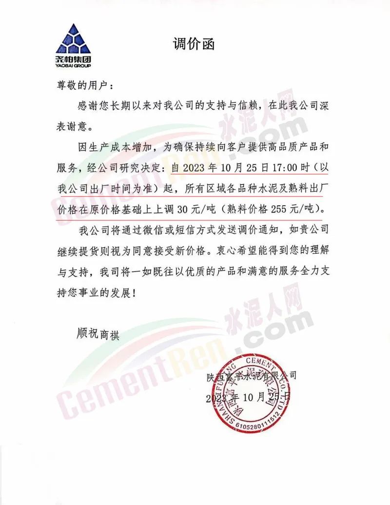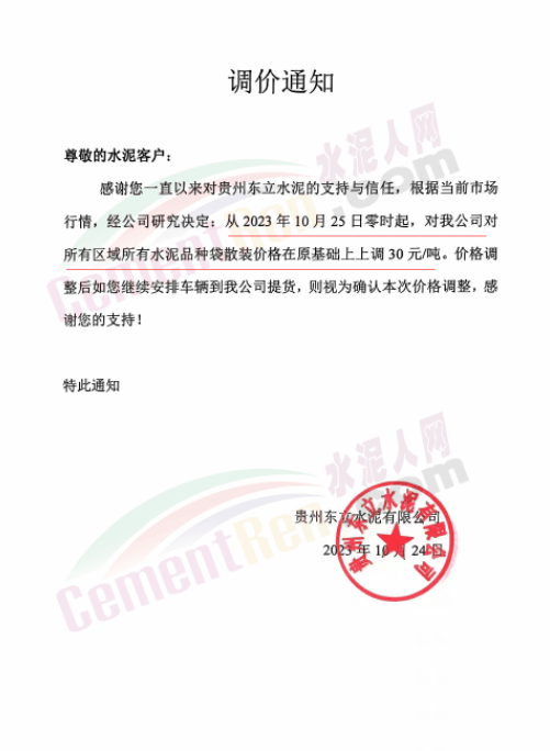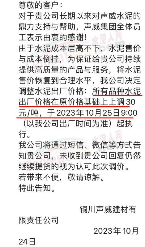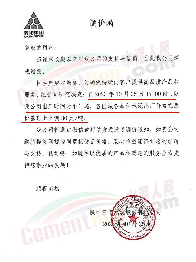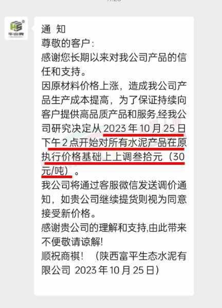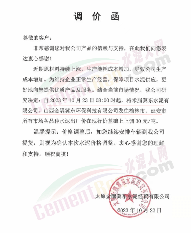 金隅冀东经贸公司通知,由于近期原材料持续上涨,生产能耗成本增加,导致公司生产成本增加。为维持企业正常生产经营,保障项目水泥供应,经研究决定自2023年10月23日8时起,将米脂冀东水泥有限公司、山西金隅冀东环保科技有限公司发往榆林市、延安市所有市场各品种水泥出厂价上调30元/吨。