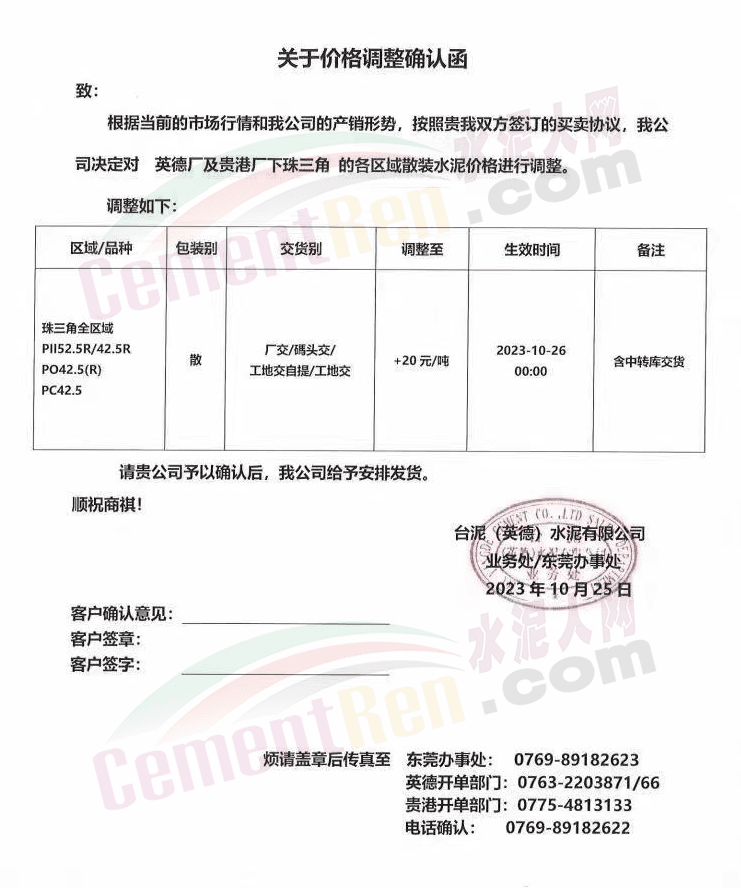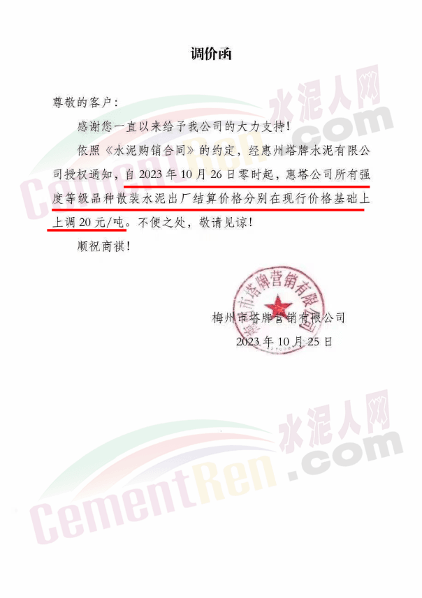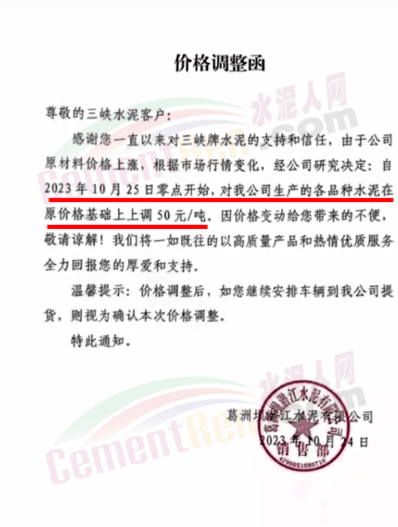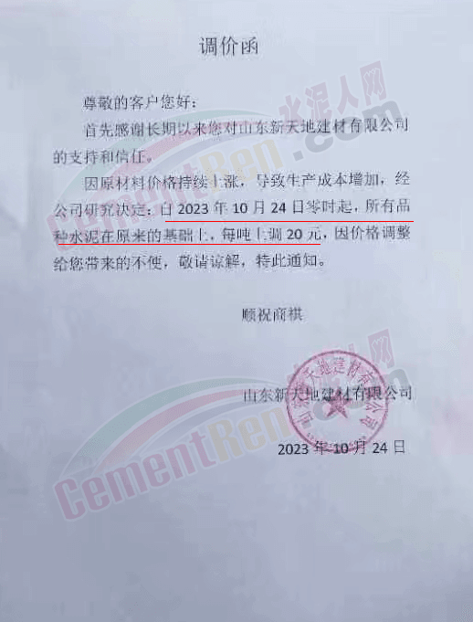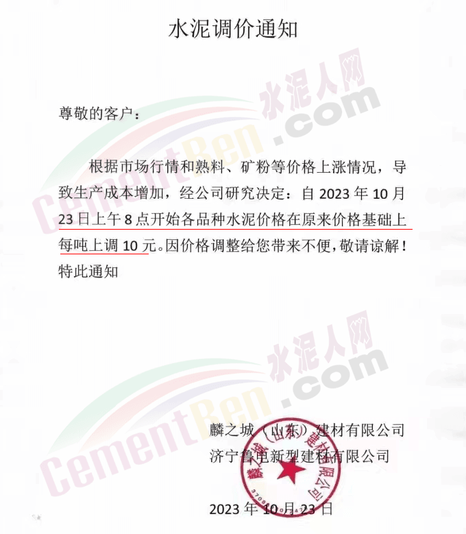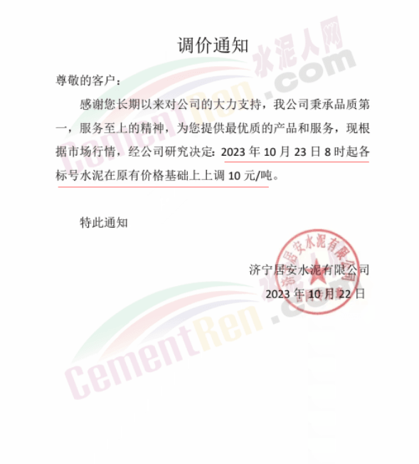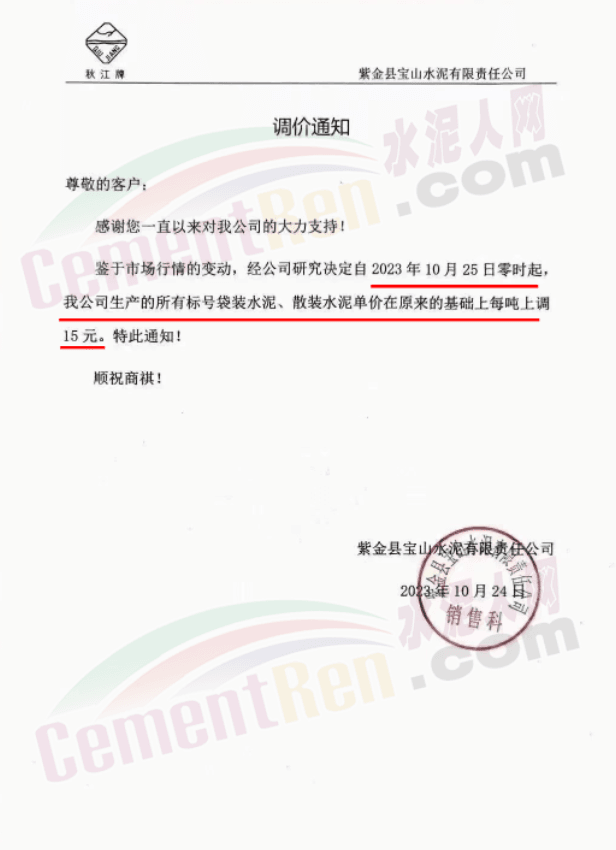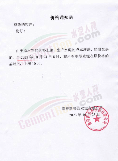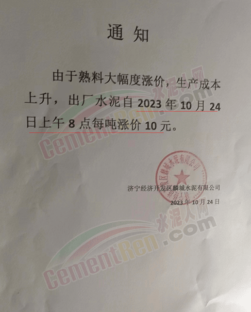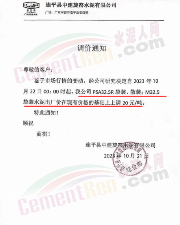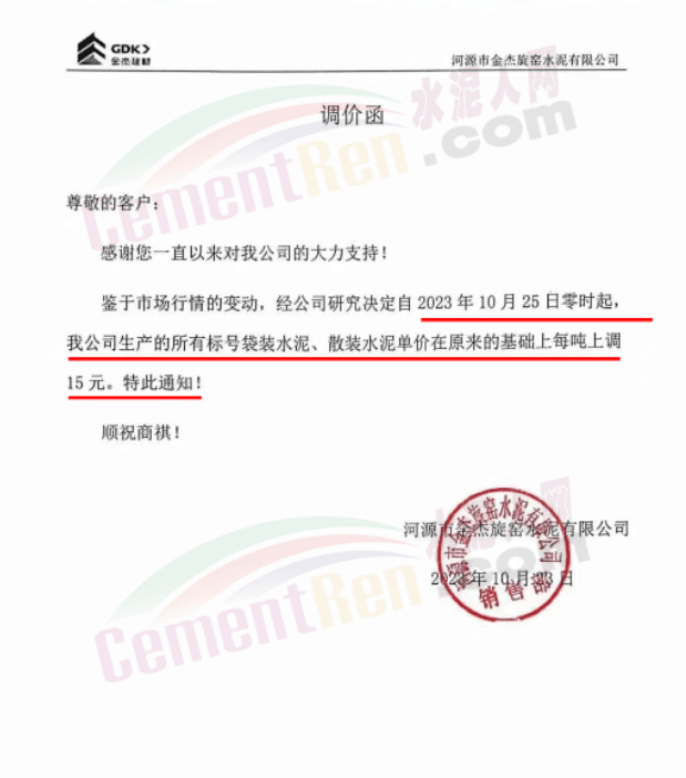 金隅冀东经贸公司通知,由于近期原材料持续上涨,生产能耗成本增加,导致公司生产成本增加。为维持企业正常生产经营,保障项目水泥供应,经研究决定自2023年10月23日8时起,将米脂冀东水泥有限公司、山西金隅冀东环保科技有限公司发往榆林市、延安市所有市场各品种水泥出厂价上调30元/吨。
