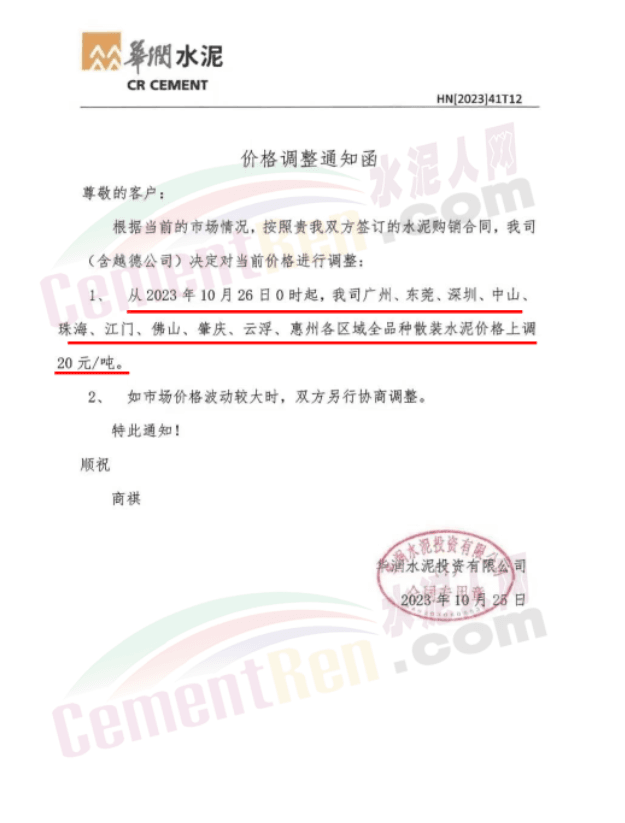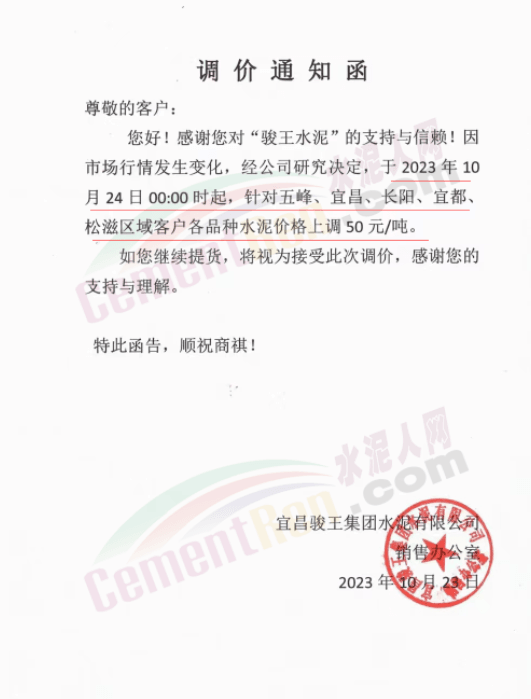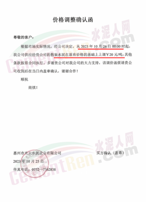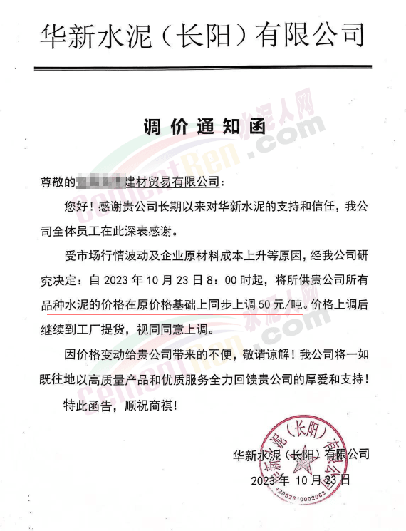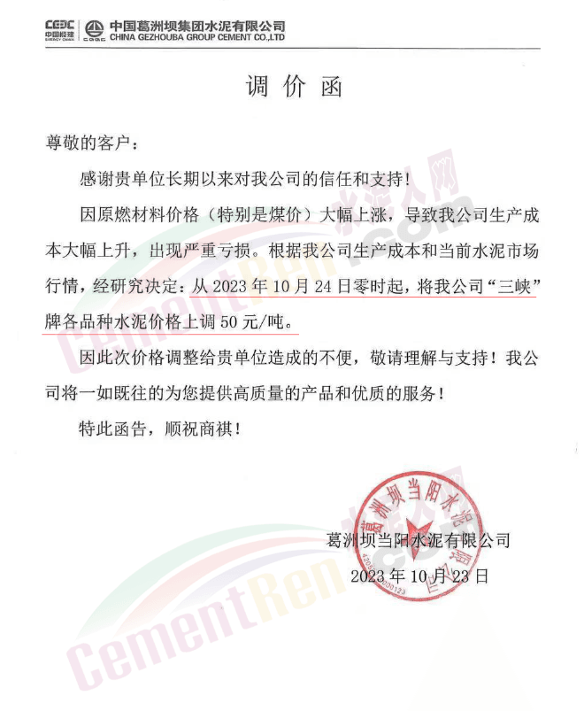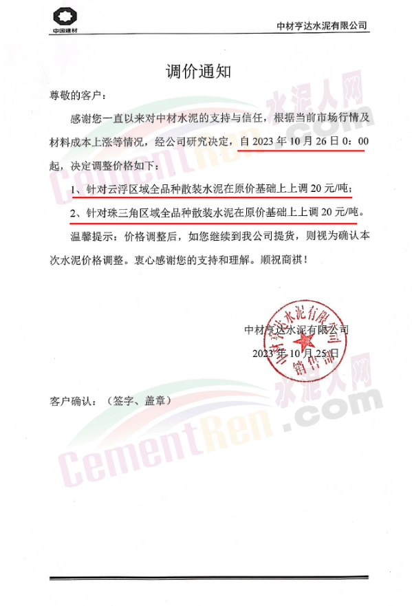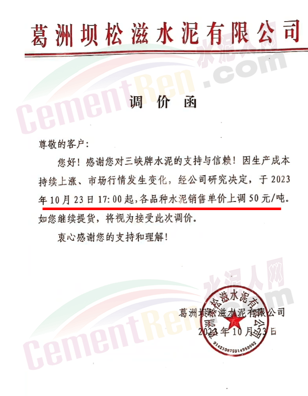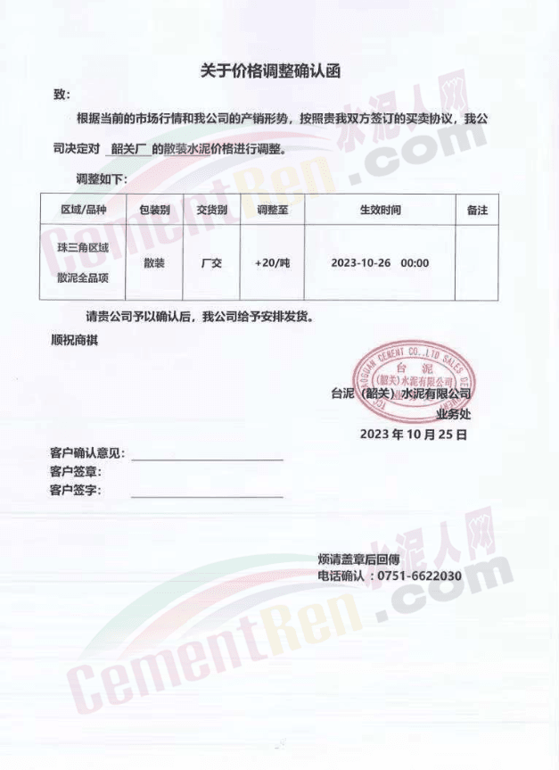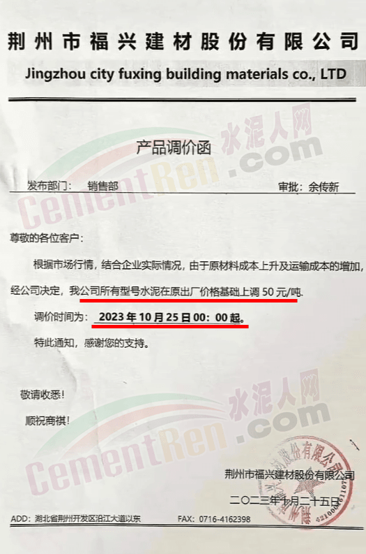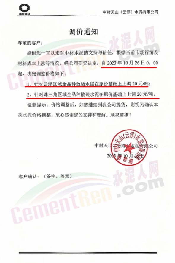 金隅冀东经贸公司通知,由于近期原材料持续上涨,生产能耗成本增加,导致公司生产成本增加。为维持企业正常生产经营,保障项目水泥供应,经研究决定自2023年10月23日8时起,将米脂冀东水泥有限公司、山西金隅冀东环保科技有限公司发往榆林市、延安市所有市场各品种水泥出厂价上调30元/吨。