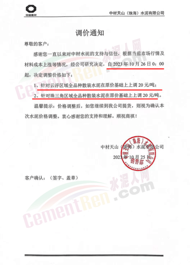 广东珠三角及周边区域中材、华润、塔牌、光大、台泥等多家主要品牌企业通知自10月26日起上调水泥报价15~20元/吨。