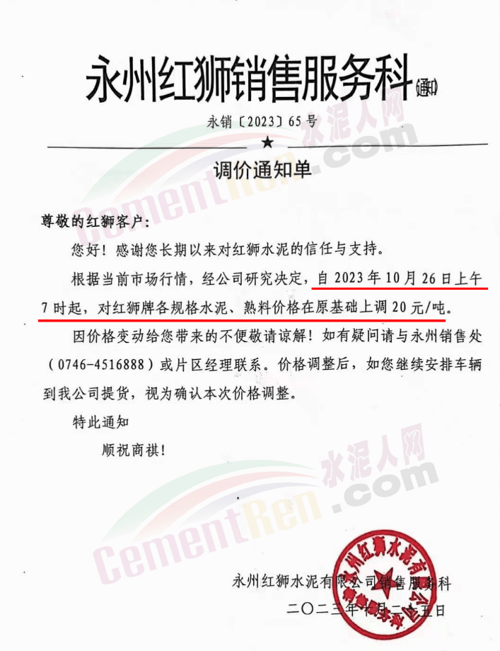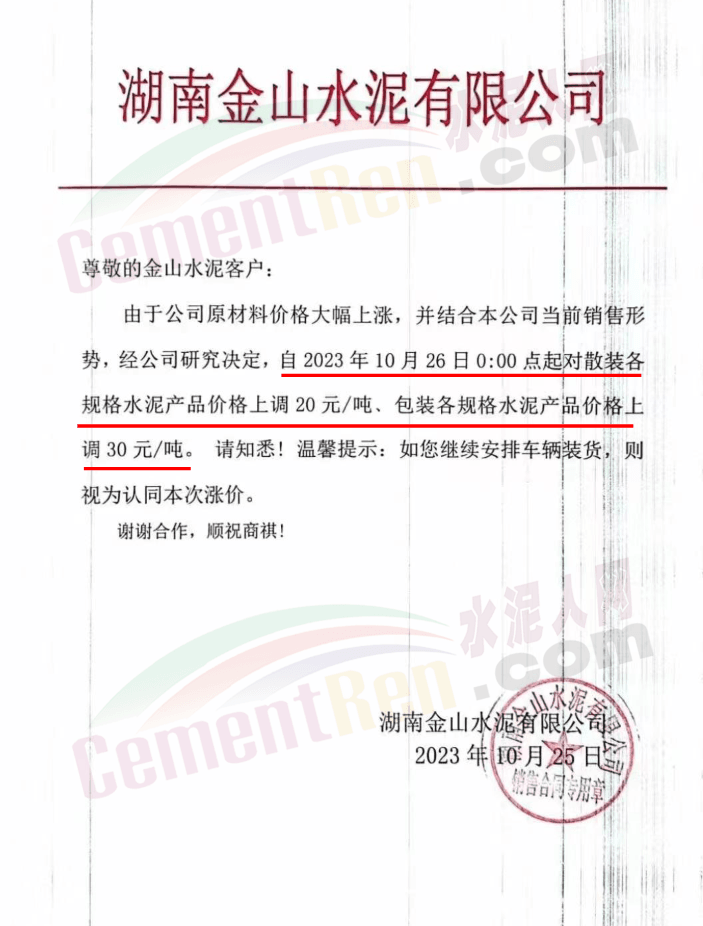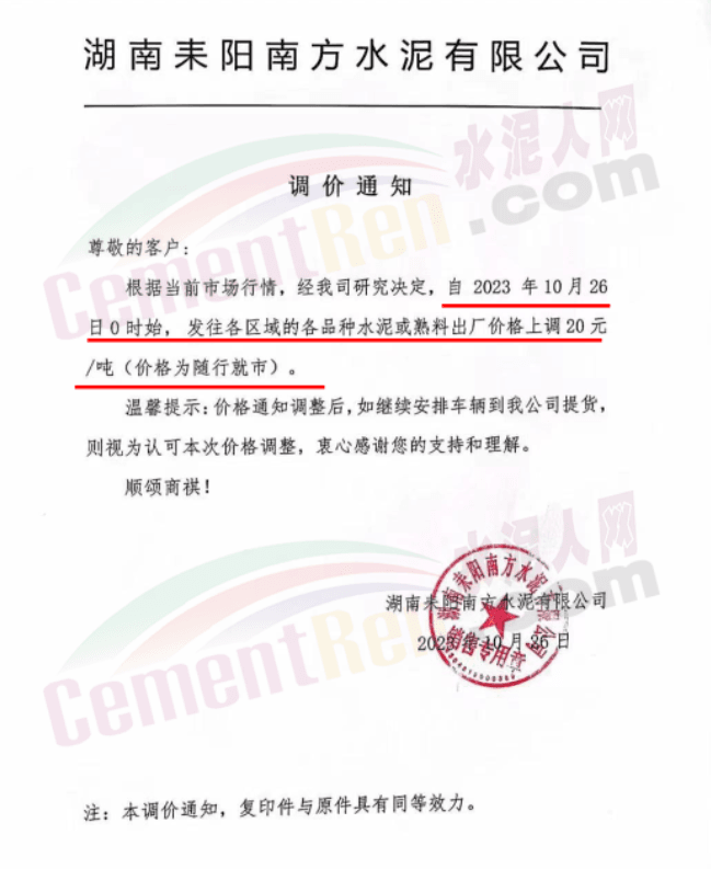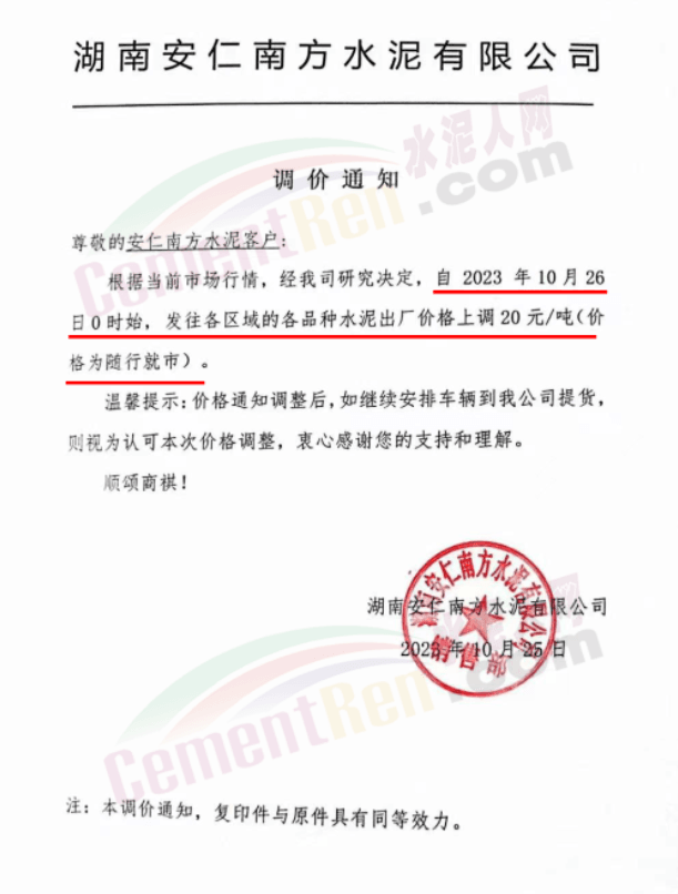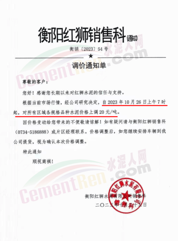 湖南耒阳南方、安仁南方、衡阳红狮、永州红狮、金山水泥等通知,自10月26日起上调水泥和熟料报价20元/吨。