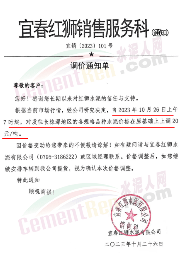 宜春红狮通知,自10月26日起,对发往湖南长株潭地区的各规格品种水泥报价上调20元/吨。