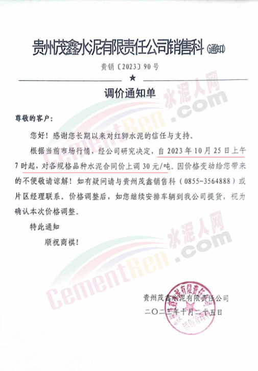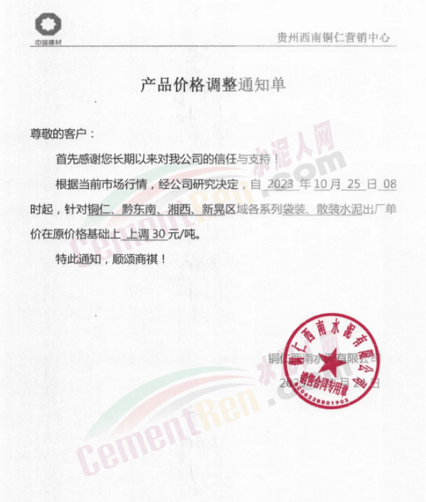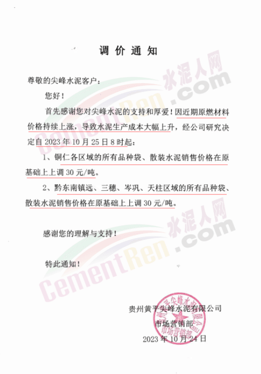 贵州铜仁、黔东南等区域茂鑫红狮、黄平尖峰、铜仁西南、贵州东立等多家主要品牌水泥企业再次通知上调水泥报价30元/吨。企业调价通知称,因近期原燃材料价格持续上涨,导致水泥生产成本大幅上升,经公司研究决定自10月25日起各品种水泥价格上调30元/吨。