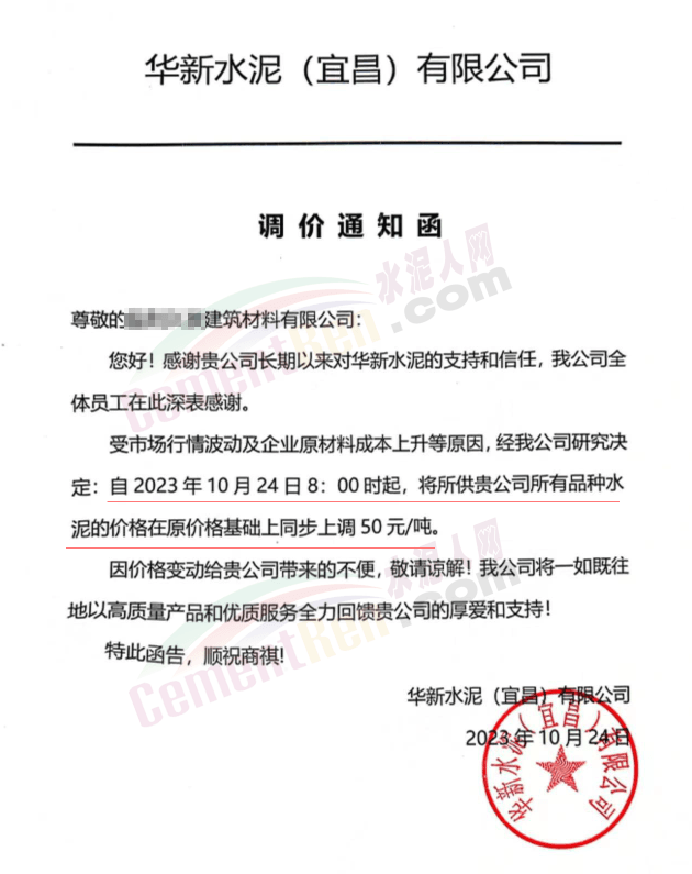 湖北华新水泥、葛洲坝水泥、骏王水泥等通知上调水泥报价50元/吨。