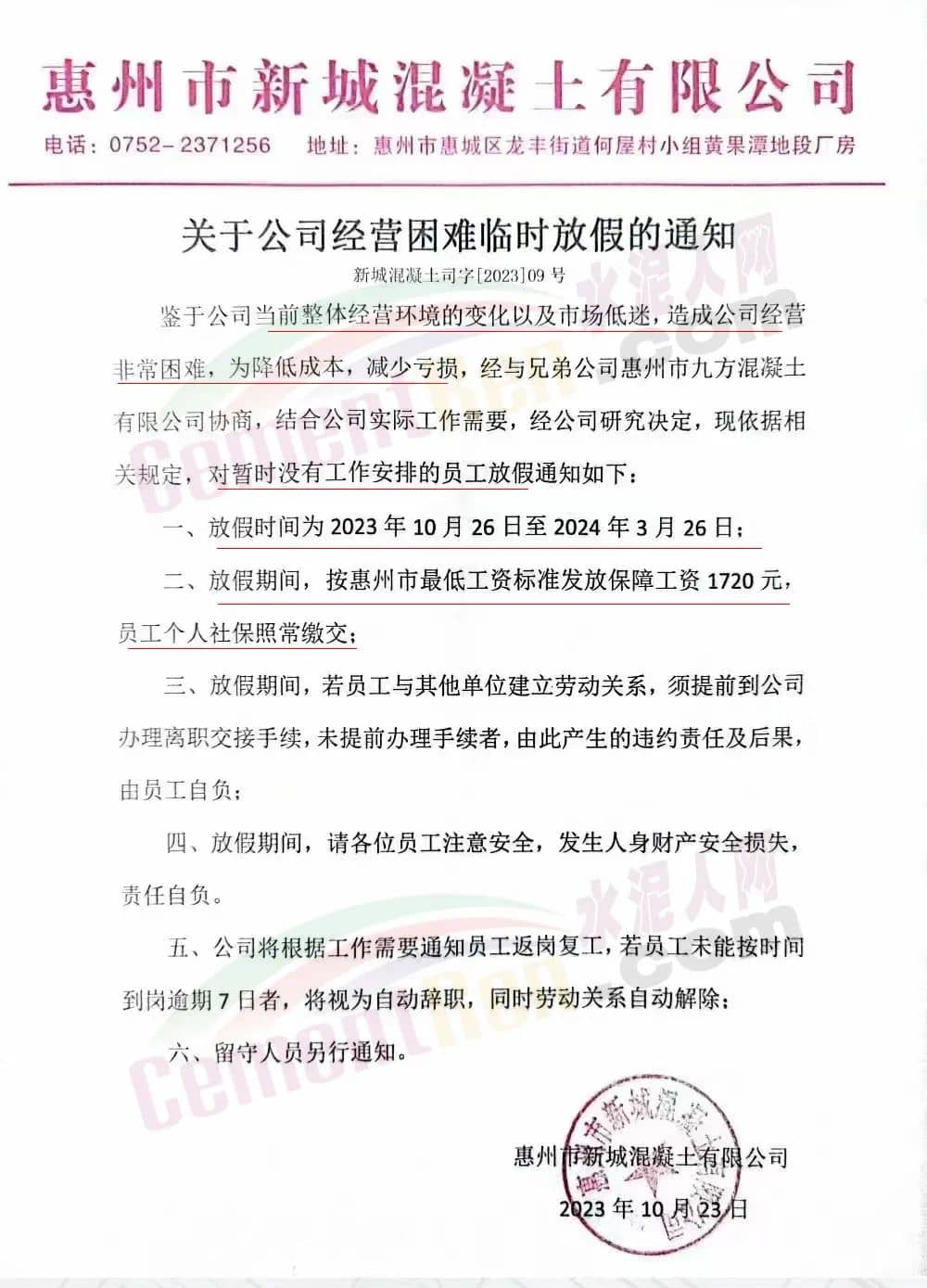 日前,广东惠州市新城混凝土有限公司发布《关于公司经营困难临时放假的通知》称,鉴于公司当前整体经营环境的变化以及市场低迷,造成公司经营非常困难,为降低成本,减少亏损,经与兄弟公司惠州市九方混凝土有限公司协商,结合公司实际工作需要,对暂时没有工作安排的员工从2023年10月26日至2024年3月26日放假。放假期间,按惠州市最低工资标准发放保障工资1720元,员工个人社保照常缴交。