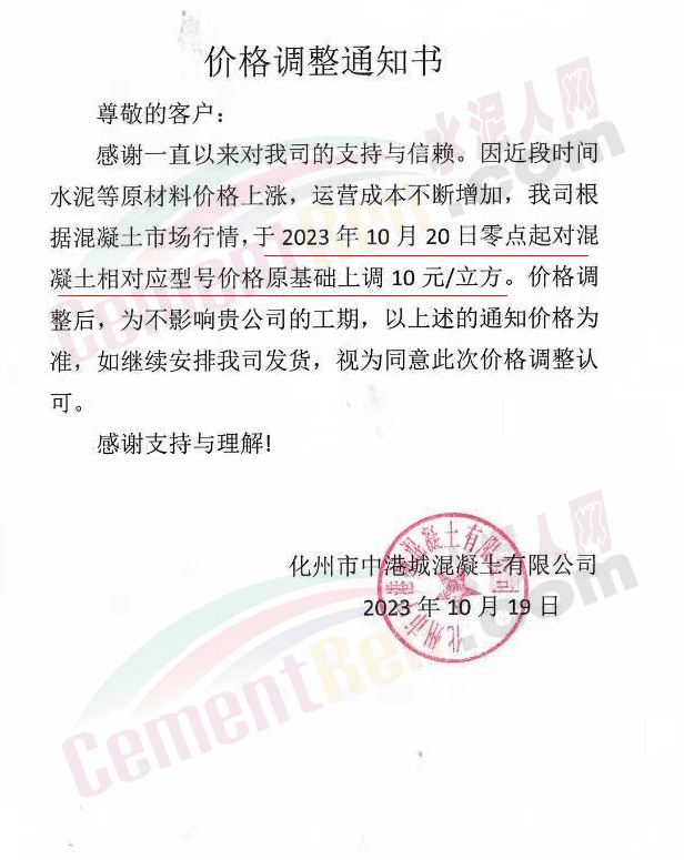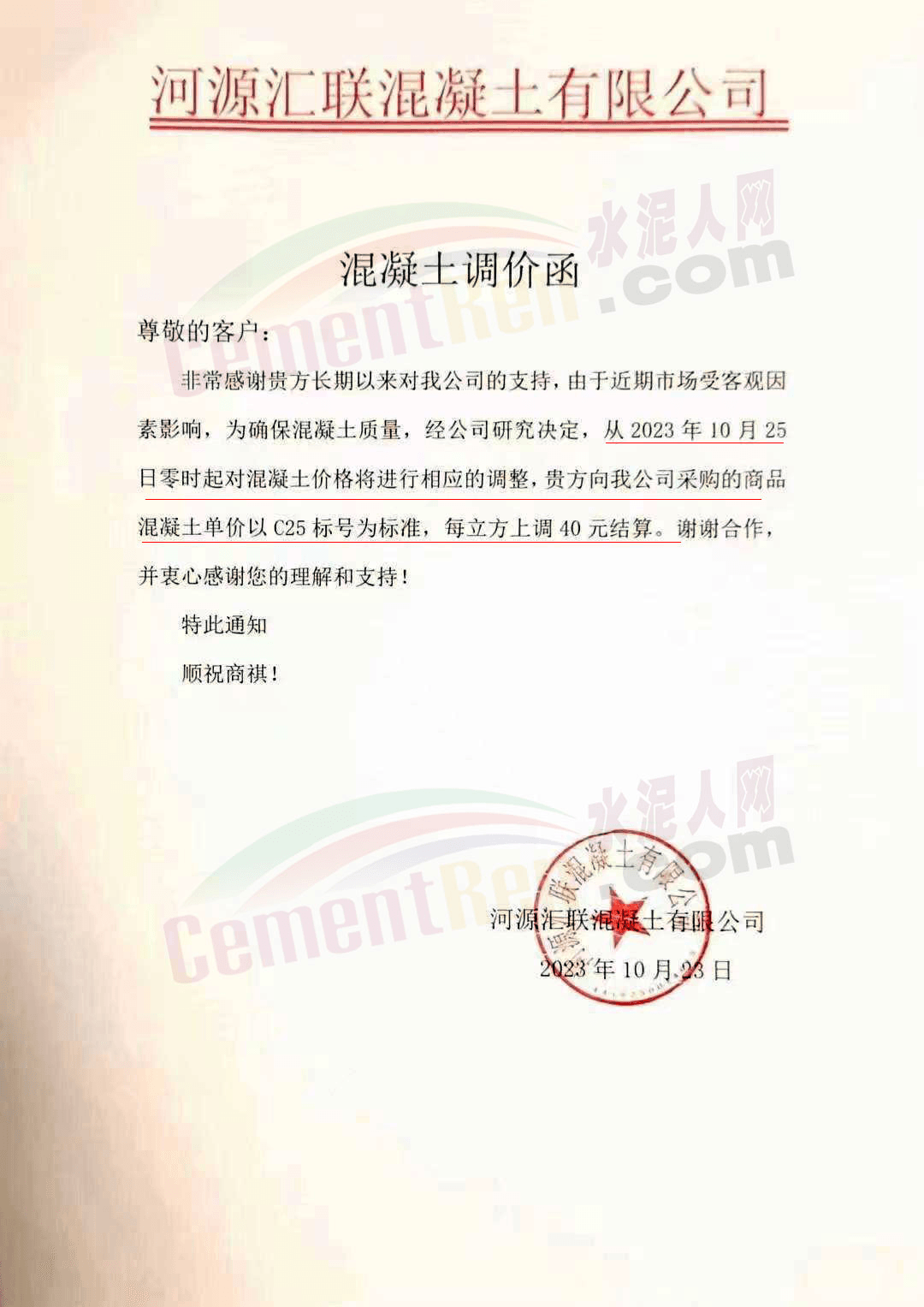 同期,河源一家商混企业一次性上调报价40元/吨。企业调价通知称,由于近期市场受客观因素影响,为确保混凝土质量,经公司研究决定从10月25日零时起上调混凝土报价。