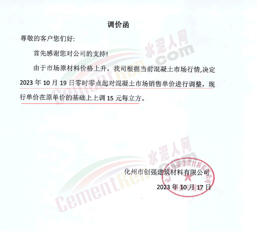 茂名化州区域混凝土企业调价通知称,因近段时间原材料价格上涨,运营成本不断增加,根据混凝土市场行情,上调各型号混凝土报价10~15元/立方。