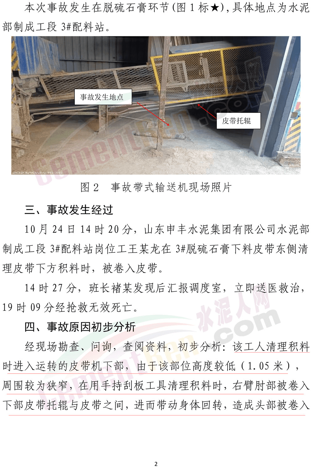 2023年10月25日,山东省应急管理厅发布了一则《事故警示》。其中提到:10月24日14时20分,山东申丰水泥集团有限公司水泥部制成工段3#配料站岗位工王某龙,在3#脱硫石膏下料皮带东侧清理皮带下方积料时,被卷入皮带。14时27分,班长褚某发现后汇报调度室,立即送医救治,19时9分经抢救无效死亡。