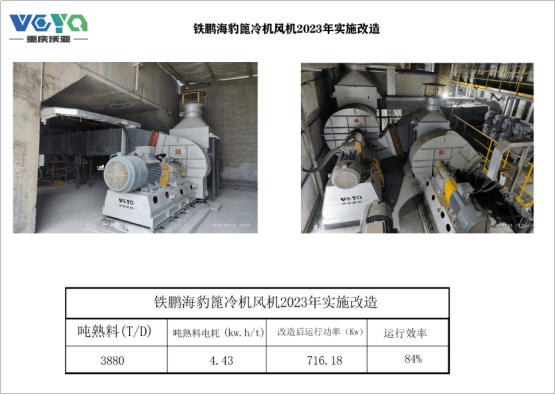 3.运行效率提高:改造后,篦冷机风机的运行效率达到了84%。这表明设备的性能得到了显著提升,生产过程更为高效,减少了资源的浪费。