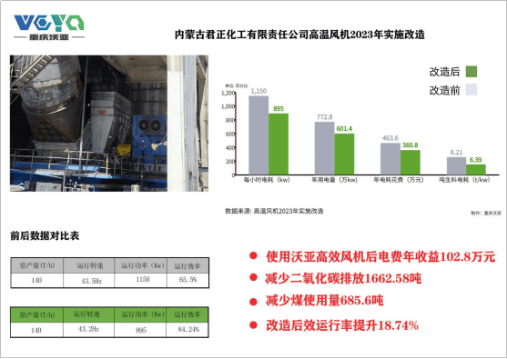 内蒙古君正化工有限责任公司水泥分公司的高效节能高温风机技改项目通过沃亚高效风机的应用,不仅取得了显著的经济效益,还为环境保护和资源节约做出了积极贡献。这一项目的成功案例表明,投资于技术改进和节能措施不仅有助于企业提高竞争力,还有助于社会的可持续发展。以下是详细数据说明: