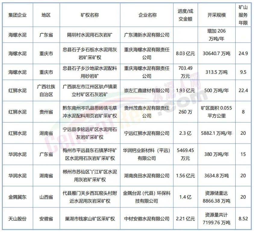 海螺水泥、红狮水泥、金隅冀东、天山股份大手笔拿矿