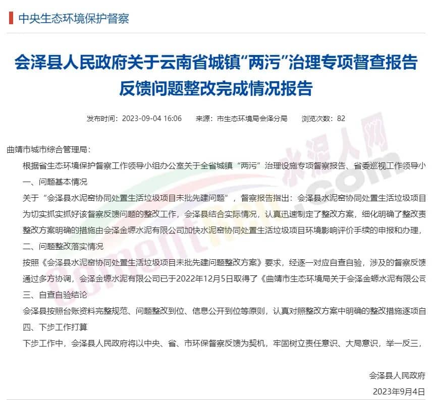 近日,云南会泽县人民政府发布《关于“会泽县水泥窑协同处置生活垃圾项目未批先建问题”》的通知,督察报告指出:会泽县水泥窑协同处置生活垃圾项目于2020年7月底开工建设,2021年3月建成并投入使用,未办理相关环保手续,2021年4月25日,曲靖市生态环境局对会泽金塬水泥有限公司未批先建行为罚款38.062万元。