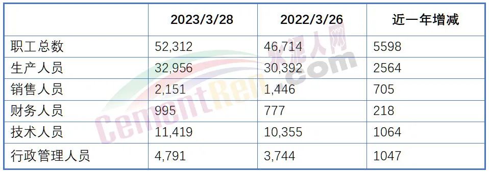 从海螺上市公司数据可见,海螺水泥员工人数已达52312人,较2022年新增5598人,前三季度人均创利16.58万元。近一年来,海螺水泥生产人员增加达2564人,技术及行政管理人员增加超千人。