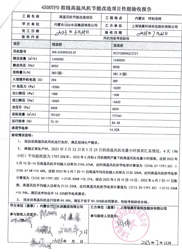 图:4500TPD窑线高温风机节能改造项目性能验收报告