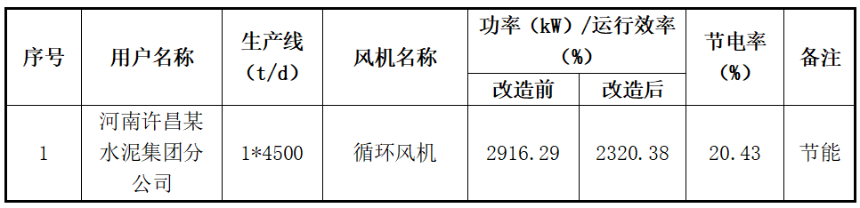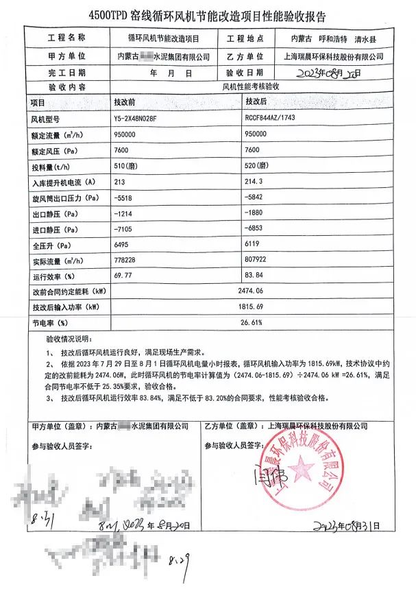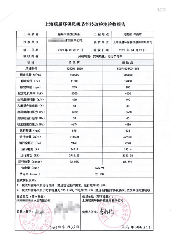 同期瑞晨环保还参与了河南许昌一家水泥公司循环风机技术改造项目的标定、设计和实施。新风机于2023年3月份安装完成,改造后循环风机运行效果较好,小时节电量达到了595.91kWh,节电率达到了20.43%,节电效果显著,项目于2023年4月完成测试、验收。